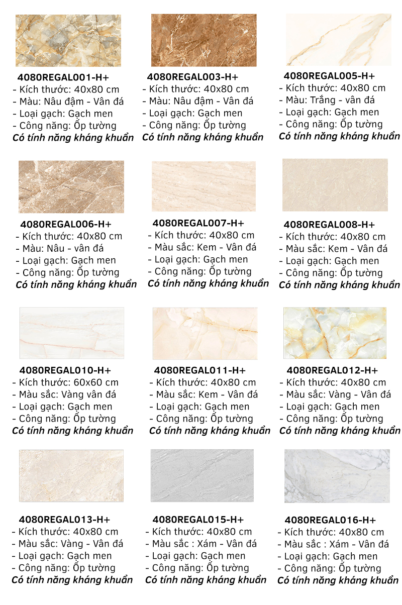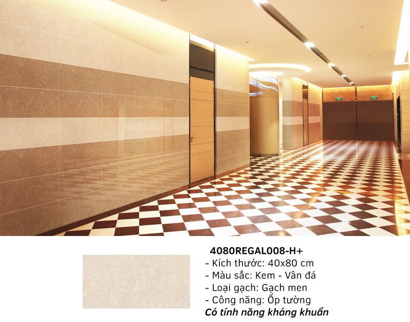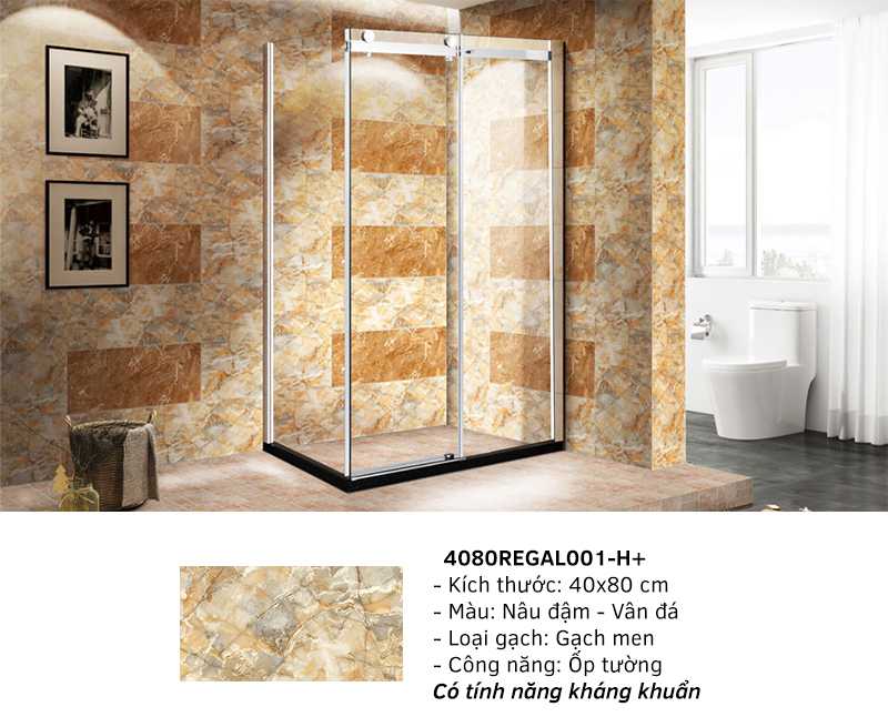 Đầu tiên phải kể đến mã gạch 4080 REGAL 00 - H+ có màu nâu họa tiết vân đá, kích thước 40x80cm , đặt biệt với tính năng kháng khuẩn sẽ rất thích hợp để ốp tường phòng tắm, nhà vệ sinh...